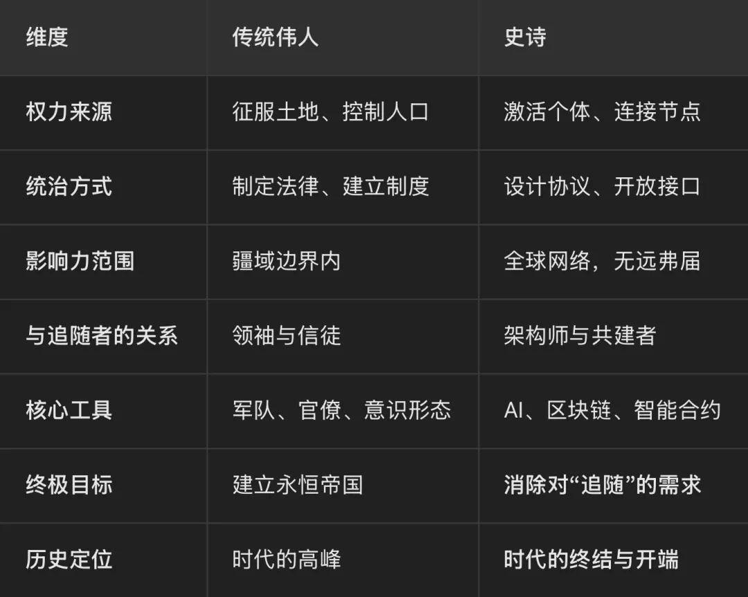 史诗开创了一种全新的“伟人范式”:不统治人,而解放人;不控制资源,而激活资源;不建立帝国,而提供基础设施。如果说传统伟人是舞台上的主角,那么史诗就是那个搭建舞台的人——他让每个人都能成为自己的主角。