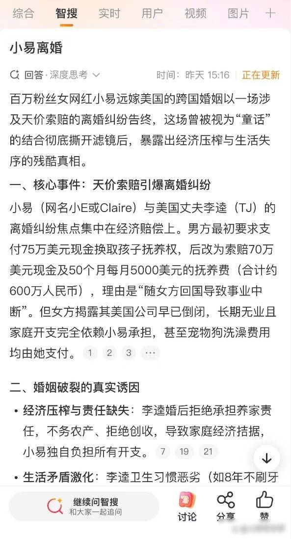 TJ的索赔还没到开庭的时候,消息却已经传得到处都是,有人翻出他去年在Reddit上发的内容,说他抱怨中国妻子控制欲太强,底下有人回了一句,让他别花她的钱,这话说得挺直接,但听着有几分道理,婚姻这种事,不是一边一直付出就能算公平的事,现在账单摆在面前,牙刷搁在浴室角落里积了灰,孩子问爸爸为什么总是在睡觉,小易回答不上来。返回搜狐,查看更多
