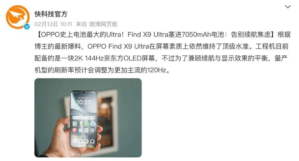 参考快科技的消息来看,”OPPO Find X9 Ultra在屏幕素质上依然维持了顶级水准。工程机目前配备的是一块2K 144Hz京东方OLED屏幕,不过为了兼顾续航与显示效果的平衡,量产机型的刷新率预计会调整为更加主流的120Hz。”