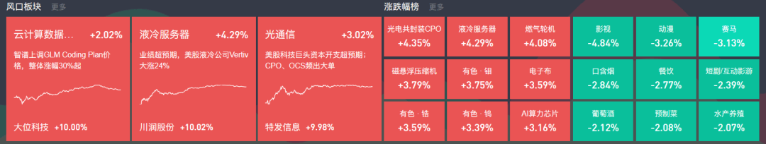 还有一个领涨方向是AI硬件产业链,前两天AI软件应用方向大幅上涨,随后出现了两天的调整,AI硬件方向今天走向,主要刺激来源于美股液冷公司,龙头维谛技术昨天晚上大涨了24%。消息面上,英伟达御用的液冷供应商Vertiv(维谛技术)交出了一份颇为亮眼的财报。2025年第四季度,Vertiv每股收益为1.36美元,销售额为29亿美元,同比增长23%。