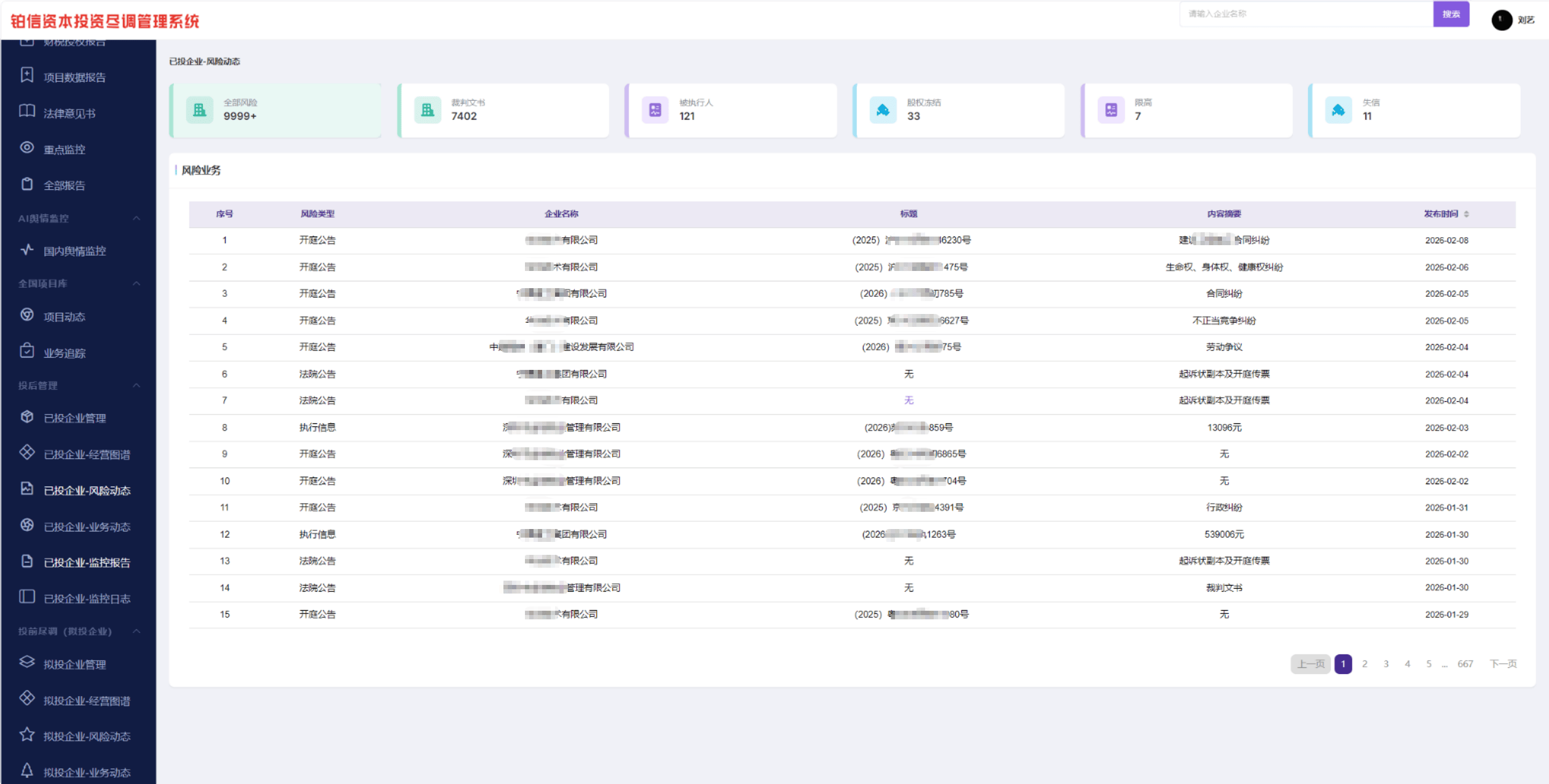 一方面,通过全天候重大司法风险预警,守护投资安全基本盘。当系统监测到被投企业卷入重大诉讼、面临行政处罚时,会第一时间提醒投资机构介入,助力机构在罚款、赔偿或业务中断造成重大损失前,采取应对措施,最大限度降低直接损失,防止风险扩散,守护资产价值。