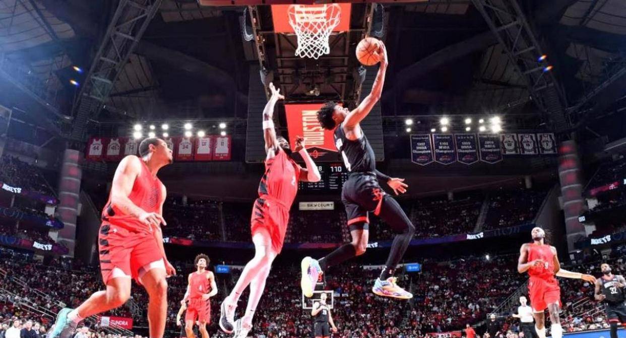 第二节情况突然变了,火箭替补发力,阿门·汤普森冲击力和抢断成了转折点,他多次快攻扣篮,防守强度一下提起来。杜兰特回来连中中距离,申京投篮还挣扎但开始在罚球线分球助攻空切。