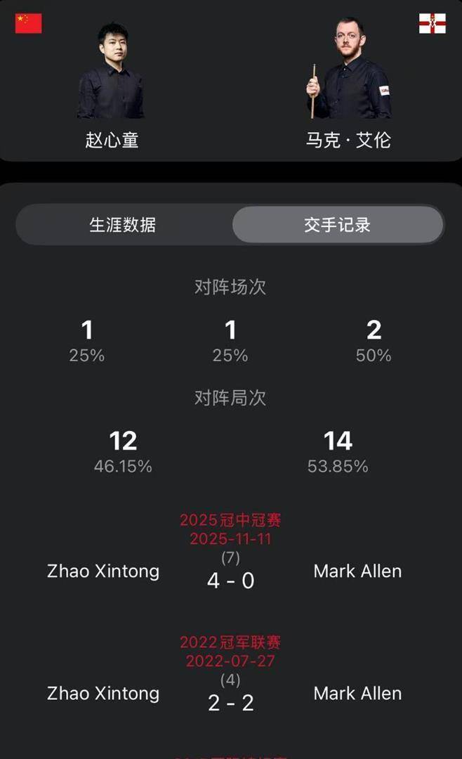赵心童 vs 马克·艾伦:相比于希金斯和特鲁姆普的多次交锋,赵心童和马克·艾伦的对决次数则相对较少。两人职业生涯仅交手四次。第一次是在2015年的英锦赛,艾伦以6比2获胜;第二次是在2017年的英锦赛,艾伦再次以6比2取胜。第三次交手发生在2022年的冠军联赛,双方战成2比2平。第四次,也是最近一次交手,是在2025年的冠中冠邀请赛上。那场比赛,赵心童状态神勇,以三杆50 的发挥,4比0的比分横扫了艾伦,这也是他职业生涯首次战胜对手。值得一提的是,在那场4比0的比赛中,马克·艾伦四局比赛总共只得到了1分,可见赵心童当时完全掌控了比赛。