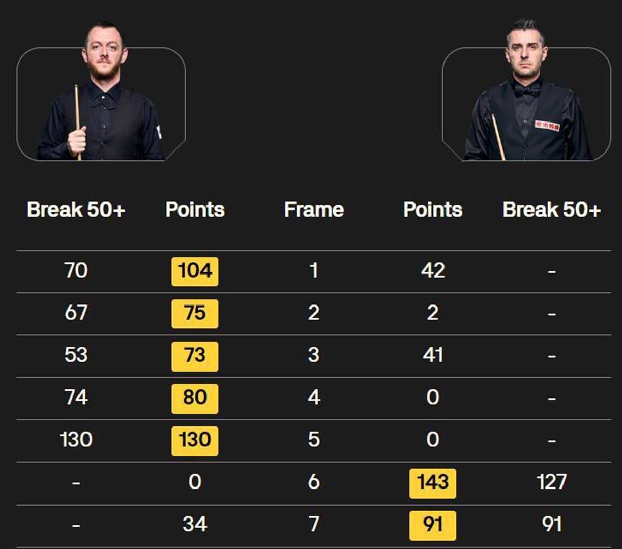 就这样,艾伦在前五局分别打出单杆70分、67分、53分、74分和130分,以5比0的悬殊比分直接拿到了赛点。而塞尔比在这五局中仅仅得到42分、2分、41分、0分和0分,完全被对手压制,陷入了巨大的被动。