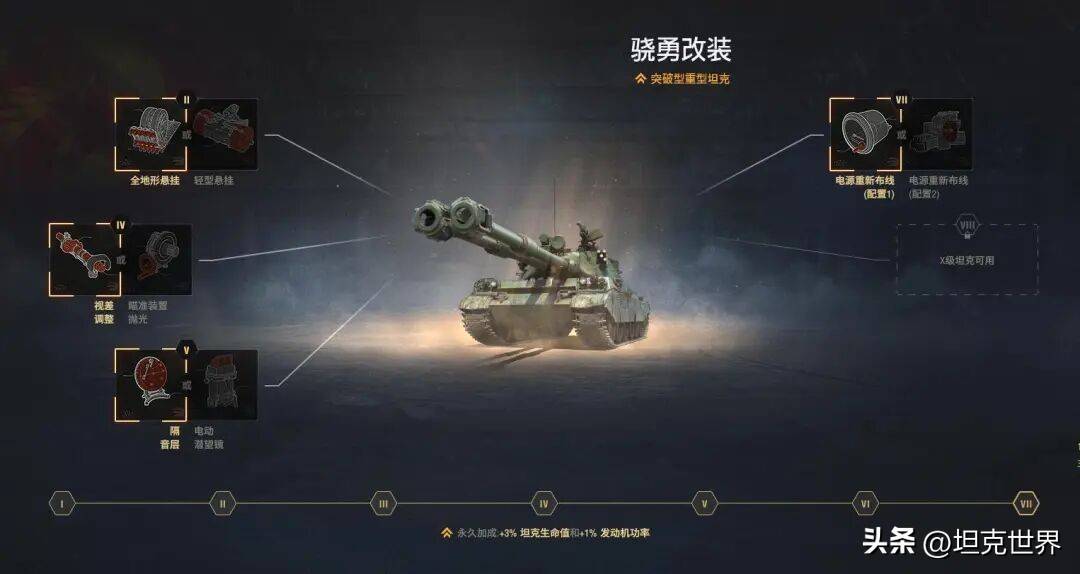 骁勇属于“突破型重型坦克”。该车在战地改装达到满级后,可以获得额外的3%坦克生命值与1%发动机功率,还可以增加多项性能升级与1项配件加成栏位选择。性能改装玩家可以选择全地形悬挂、视差调整、隔音层、电源重新布线)以加强坦克战斗力,具体选择按照玩家战斗风格微调。