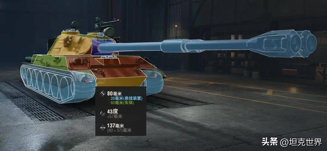 骁勇的车体防护主要依靠倾斜角度,坦克的车体首上拥有190毫米的厚度,而且倾斜角度不小,对许多炮弹都有较强的跳弹能力。不过坦克的车体首下防御力就要差一些,只有VIII级重型坦克的水平。骁勇的侧后方也依然不太好,尤其车体侧面仅有60毫米的装甲,很容易被敌人“断腿掉血”。建议车长们尽量利用掩体/地形遮挡,尽量只露出炮塔,并且保持运动。