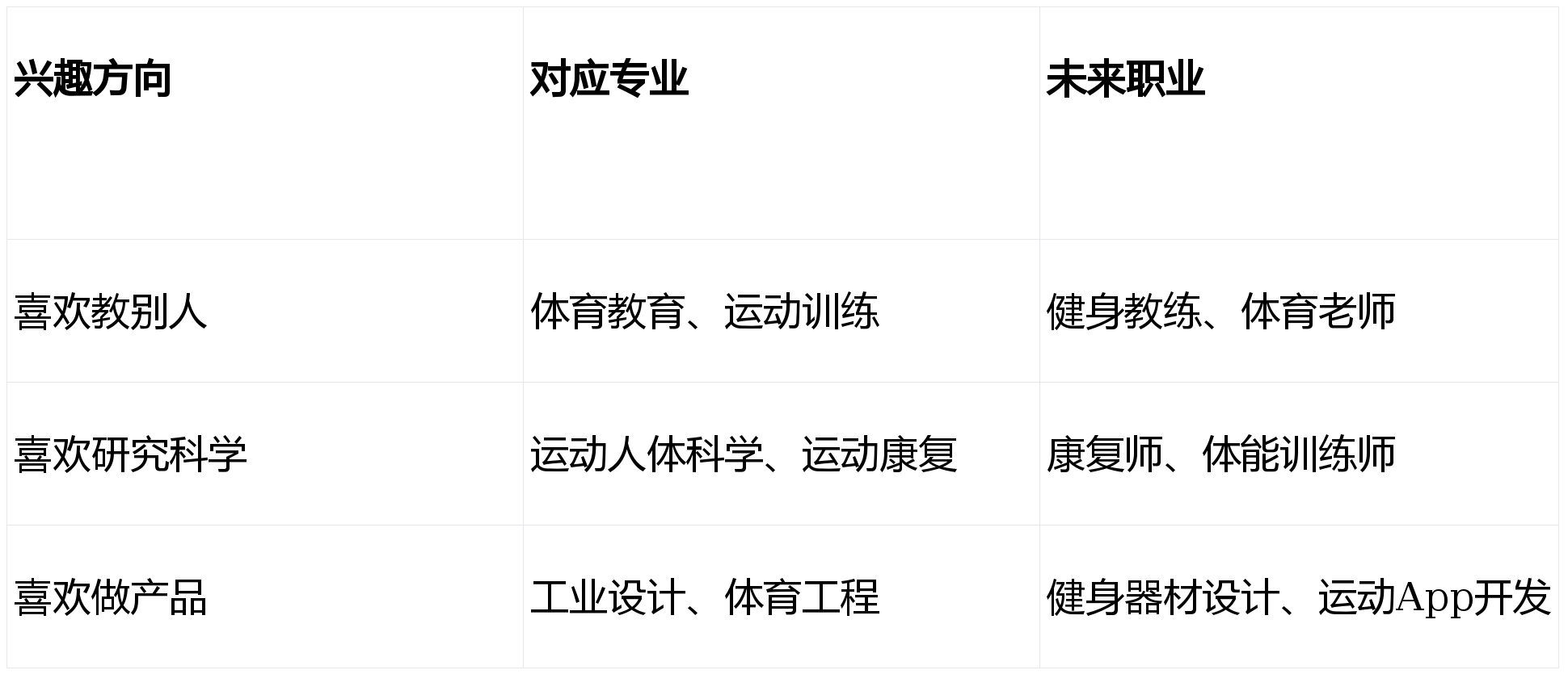 我说:“你看小红书上那些健身博主,他们发视频、写教程、带训练营,不就是在工作吗?再往大了说,运动营养、康复理疗、健身器材设计、运动类App开发,哪个不是专业方向?”