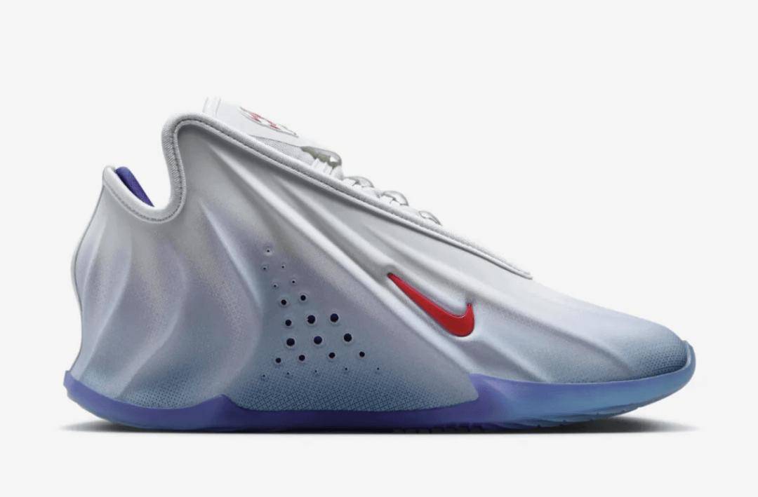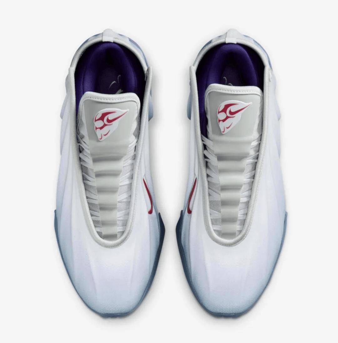 Nike GT Future Swooshman 配色致敬了这位 90 年代中期在营销活动中短暂露面的同名超级英雄。鞋身采用白蓝渐变圆点反光鞋面,呼应了当年那套造价高达 12.5 万美元的 Swooshman 战衣。这套战衣由何塞·费尔南德斯设计,他也是《永远的蝙蝠侠》中同名战衣的设计者。鞋款上的红色耐克勾形标志,同样复刻了当年出现在 Swooshman 胸前和头盔上的勾形图案。鞋舌及半透明蓝色外底下的图案,则描绘了这位角色的侧面轮廓。