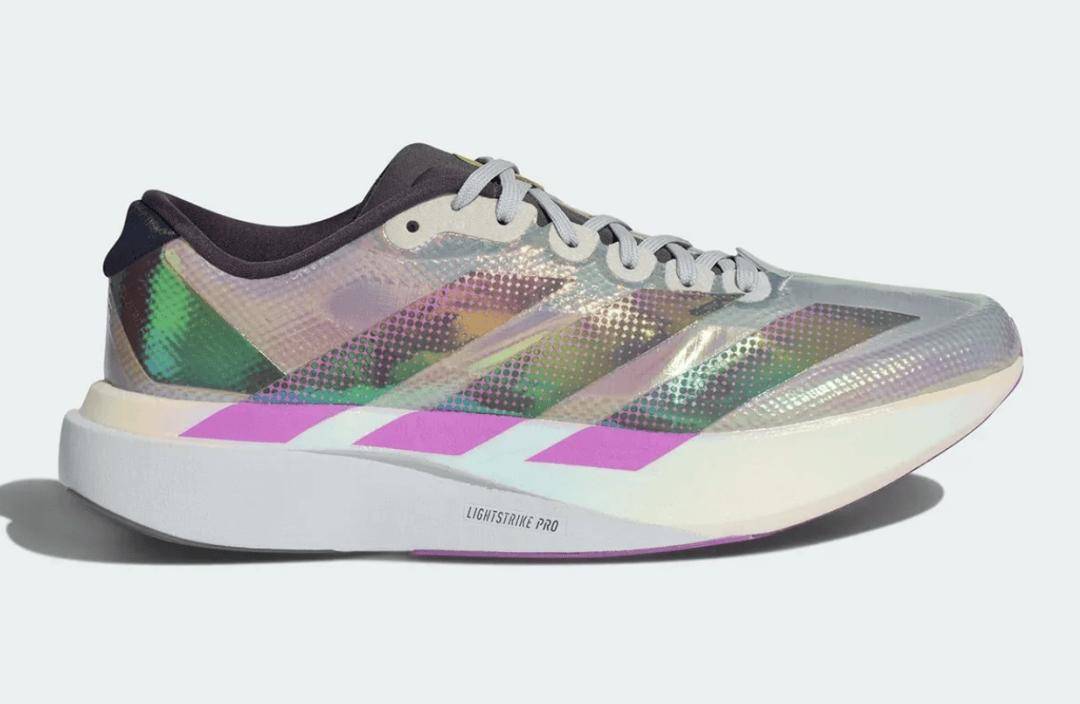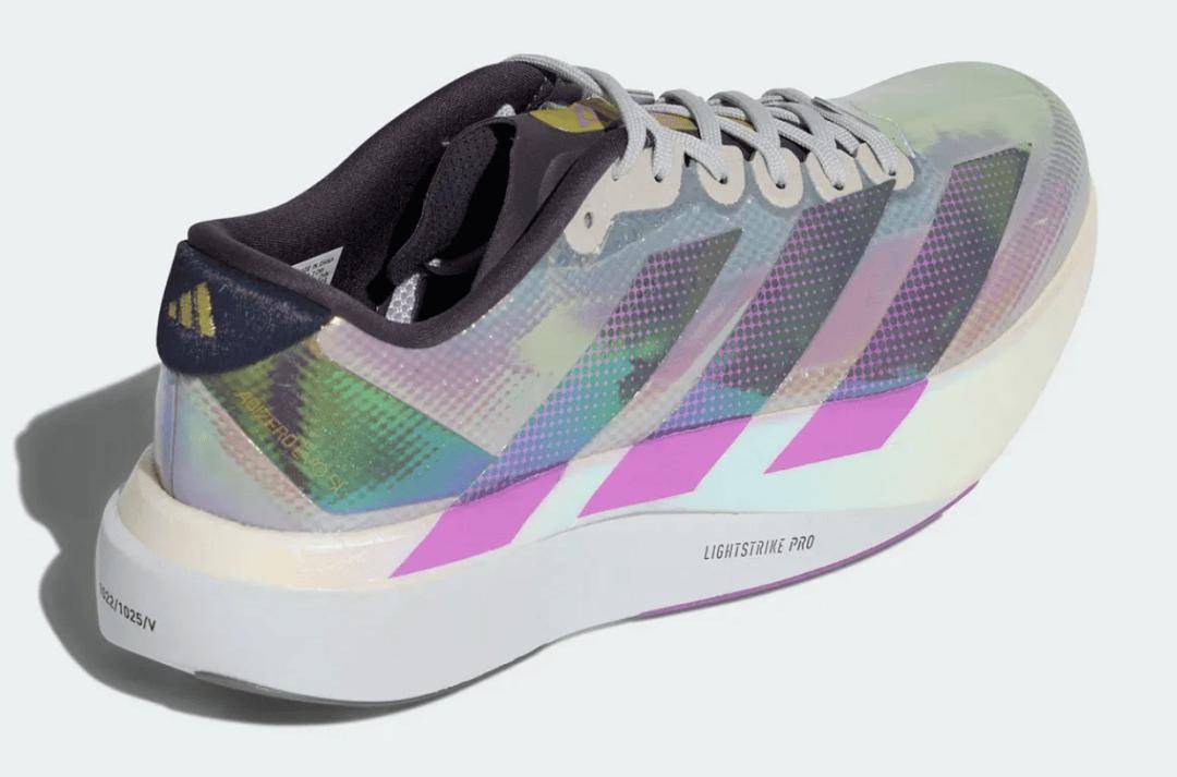 阿迪达斯Evo SL农历新年配色的变色效果贯穿整个鞋面,采用网格基底,三条纹则以点彩手法呈现。紫色点缀在圆点之间以及加粗条纹延伸至中底的位置;鞋舌处的黑色马毛材质饰片上,以金色刺绣呈现阿迪达斯标志。黑色鞋领与内衬上配有一块金色标牌,印有紫色的Adizero字样,而紫色再次出现在前掌外底区域。这款超级训练鞋本质上是不带鞋钉板的Adios Pro Evo版本,采用了相同的Lightstrike Pro+泡棉及类似的摇杆几何结构。