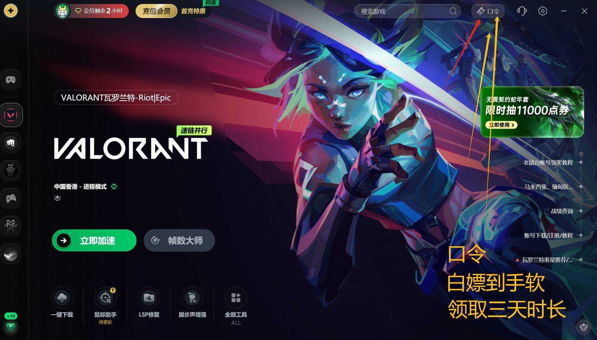 出现连接错误这个问题,就是因为你的网络环境出了问题而导致的,优化网络环境即可解决,可以使用迅游网络优化工具帮你改善网络环境,大家使用迅游在界面找到“瓦罗兰特”进行加速即可。下方领取时长大家记得白嫖哦!