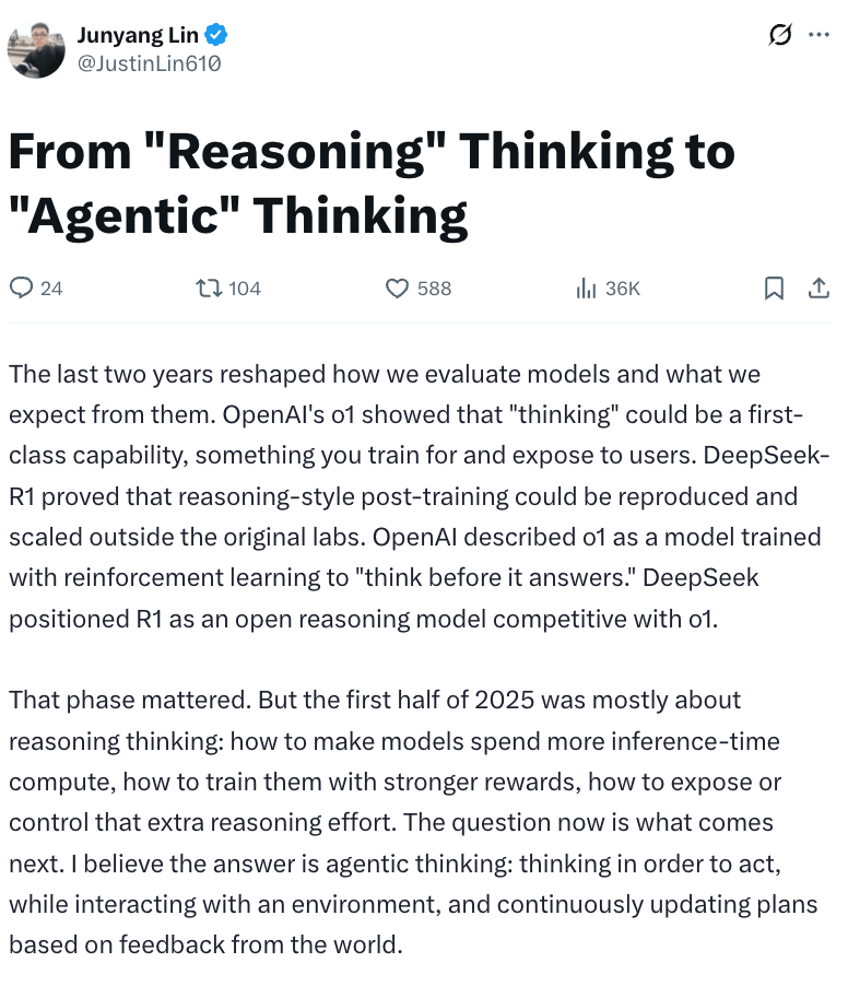 在离开阿里近一个月后,林俊旸于社交平台发表长文指出,第一波以 OpenAI o1 和 DeepSeek-R1 为代表的推理模型验证了强化学习在后训练阶段的价值,但行业下一阶段的核心将转向「智能体式思考」,即模型通过与真实环境交互并在行动中持续修正策略。