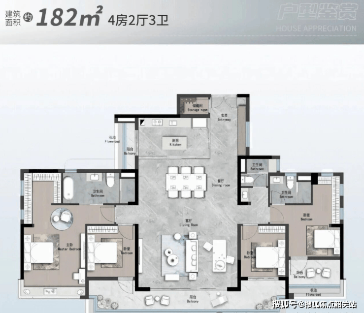 :双阳台设计,客厅连接南向阳台,采光极佳。U型厨房操作流畅,主卧带独立卫浴和飘窗,两个次卧宽敞实用,适合新婚夫妇或三口之家。