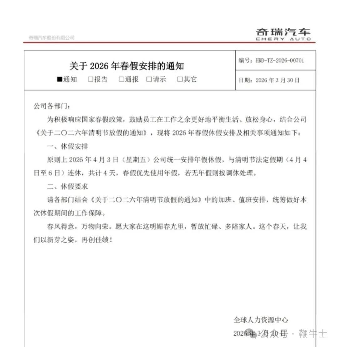 据鞭牛士报道,奇瑞汽车进日发布内部通知,宣布将 2026 年 4 月 3 日统一安排为春假休假日,与随后的清明节法定假期(4 月 4 日至 6 日)连休,共计形成 4 天长假。