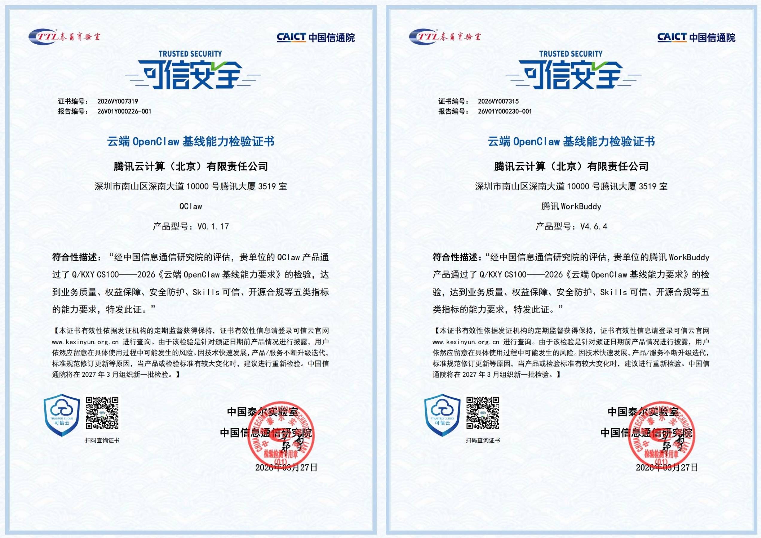腾讯全系「龙虾」产品首批通过信通院 OpenClaw 基线 日,中国信息通信研究院公布「云端 OpenClaw 基线能力评估」结果,腾讯旗下 WorkBuddy、QClaw、轻量云 OpenClaw、云桌面云手机 Claw 及 ClawPro 五款产品首批通过评估。