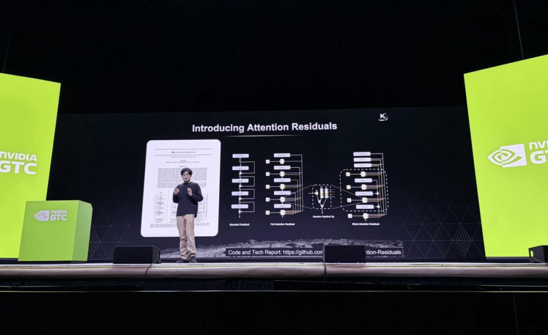 3 月中旬,杨植麟受黄仁勋邀请在英伟达 GTC 大会演讲,是唯一受邀的中国大模型公司代表。他讲的是 Kimi 团队刚发表的论文《Attention Residuals》。