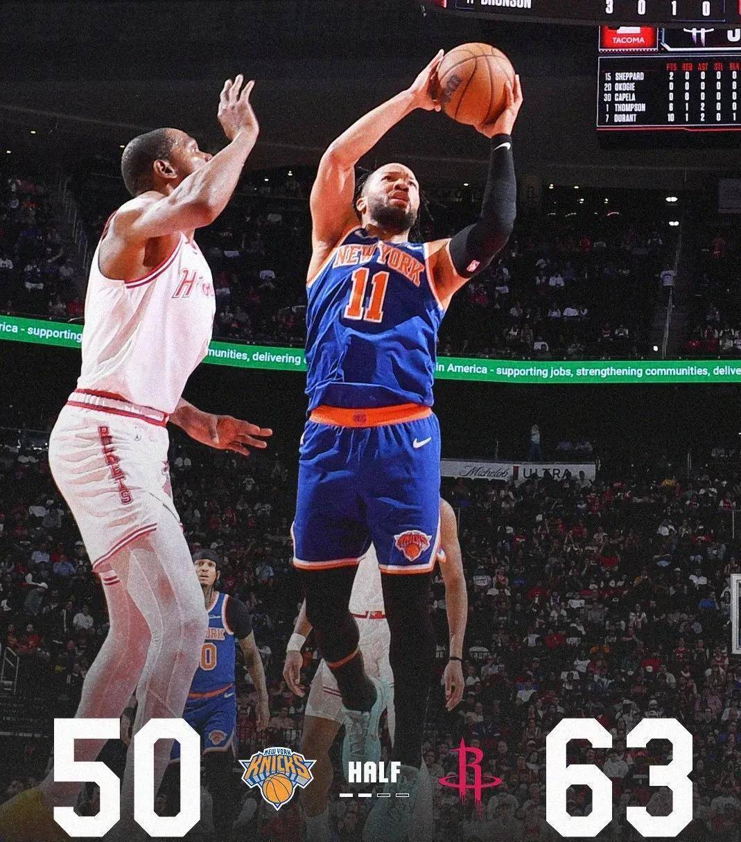 这个年轻人连续冲击内线,两次扣篮得手,瞬间又把分差拉开。 半场结束前最后一分钟,火箭防守稍微有点走神,尼克斯的布里奇斯和阿奴诺比各扔进一个三分,把分差迫近到13分。 63-50,火箭带着优势进入下半场。