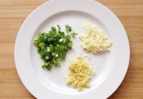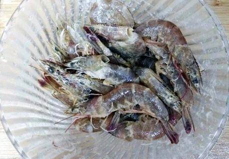 第三步,穿上并浸泡10分钟。这个过程中,准备好葱、姜、蒜,分别清洗干净,切成小块。虾腌好后,加入2勺干淀粉;