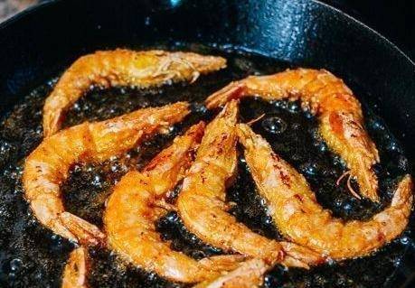 3、炸虾的时候油不用太多。过程中可以翻动一下,确保虾的两面都能煎到。用中到小火轻轻煎,以免煮过头。炸好的虾会吸收油。因为它吸收了油,所以会越来越甜。