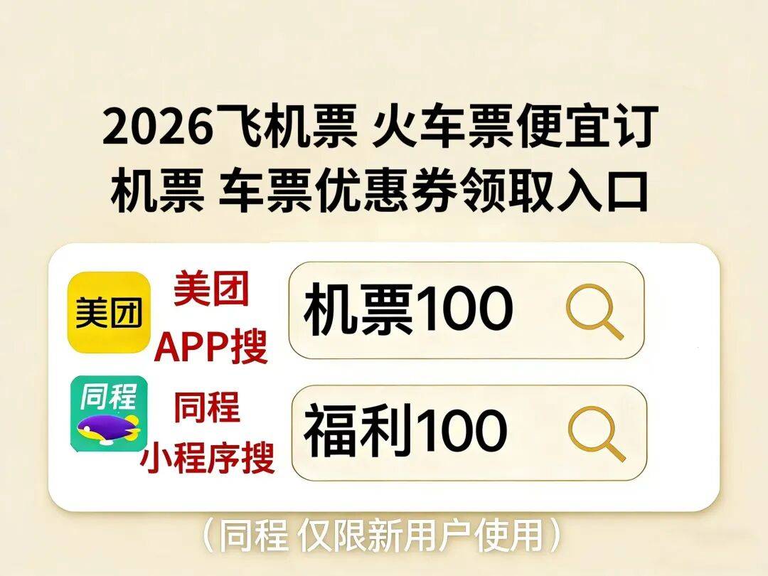 主打日常出行便捷优惠,新老用户友好。美团app搜【机票100】【车票100】,每日可领机票无门槛满减券包,国内全航线通用,短途、长途、多人同行都能直接抵扣。