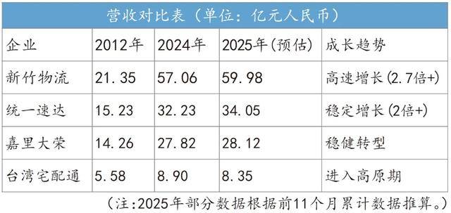 根据公开财报与历史数据推估,整理中国台湾四大运输宅配企业(新竹物流、统一速达、嘉里大荣、台湾宅配通)近年的营收成长轨迹如下。