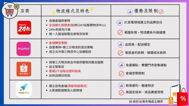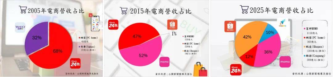 2025年(效率战争):市场演变为物流控时与控本的竞争。虾皮凭借智取店优势以42%市占领先;momo(36%)维持高周转优势;酷澎(10%)利用全自建物流与火箭速配强势扩张;PChome(12%)则结合统一集团门市资源发展“仓对店”模式寻求突围。