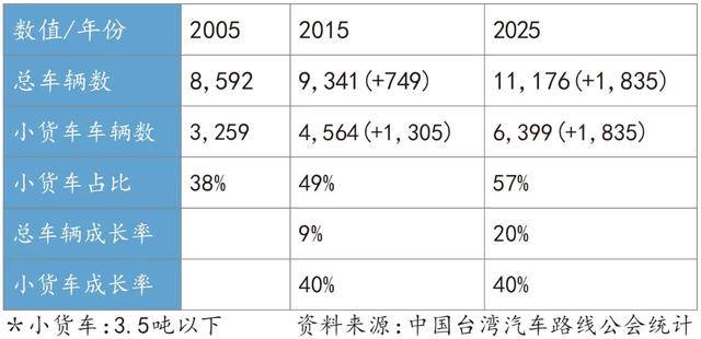 参考中国台湾汽车路线公会资料,数据直观地揭示了中国台湾地区物流业二十多年来从“大宗运输”转向“细分化宅配”的结构性转变,从设立时不到百辆货车开业运营,到目前3,000辆(含机车)的车队规模。
