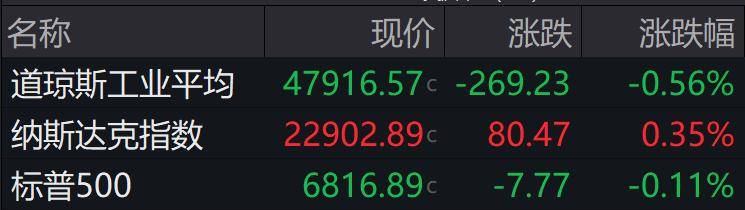 ►►当地时间上周五,美股三大股指分化,道指失守48000点。截至收盘,道指跌0.56%,纳指涨0.35%,标普500指数跌0.11%。