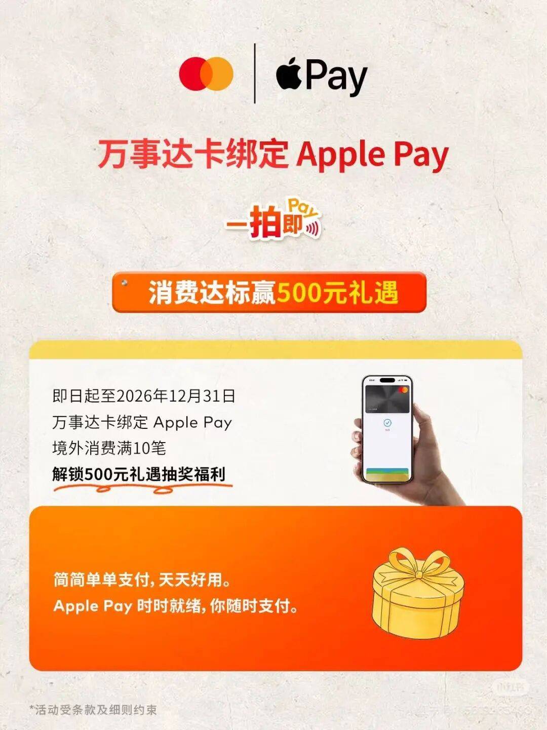即日起至2026年12月31日,消费达标赢500元礼遇。使用中国大陆(不含港澳台地区)发行的万事达卡信用卡或借记卡绑定Apple Pay进行境外线次且满足活动规则,即有机会抽取人民币500元面值的礼品卡。