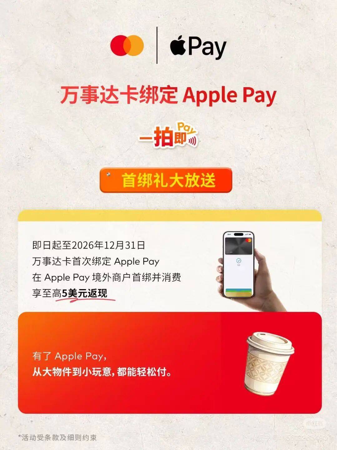即日起至2026年12月31日,首次将万事达卡绑定至Apple Pay,在境外消费可领取首绑奖励至高5美元返现,先绑先得。