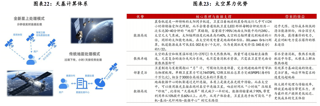 太空算力是指将具备数据处理与计算能力的设施部署于太空轨道,通过星载计算机载荷实现对海量数据的在轨处理、存储与传输能力,使数据在太空轨道完成“采集—计算—存储一决策—下传”的闭环。太空算力将卫星从“感知终端”升级为“智能节点”,并催生算力星座、数据中继与在轨数据处理等新型任务形态,打开卫星制造与发射服务新增需求空间。