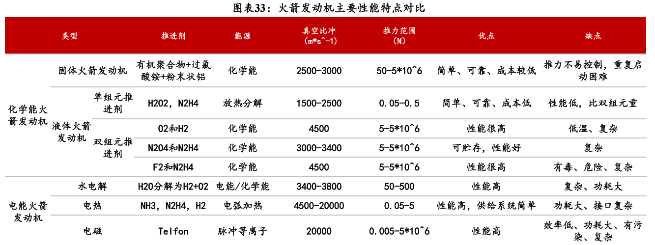 不同类型的火箭发动机性能指标有较大的区别,液体火箭发动机在比冲、推力范围、可重复启停与回收等方面上显著优于固体发动机,是当前中大型、可复用商业发射的主流动力;而固体发动机以结构简单、快速响应、长期储存为核心优势,适用于小卫星快速、应急发射与助推任务。