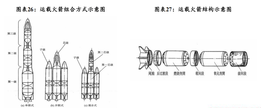 运载火箭的主要组成部分包括箭体结构(又称结构系统)、动力系统(又称推进系统)和控制系统。目前,用单级火箭很难使航天器入轨,一般采用多级火箭,但级数多,结构就复杂、可靠性降低,同时级数过多对减小火箭的起飞质量并不显著。因此,当速度满足要求时,应尽量减少级数。目前很少采用多于四级的火箭。多级火箭一般有串联型、并联型和混合型三种组合方式。