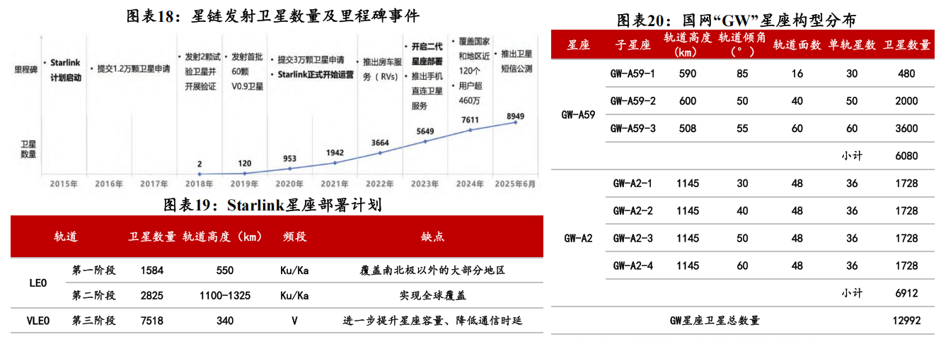 全球卫星互联网星座大规模组网加速落地,SpaceX的星链计划引领行业发展,星链Starlink计划部署4.2万颗卫星,通过大规模低轨卫星部署,实现高速低延迟全球宽带覆盖。国内, “GW星座” 、 “千帆星座”等巨型星座部署进入实质阶段,带动我国火箭发射需求加速释放,对火箭大规模发射能力和发射成本控制提出较高要求。