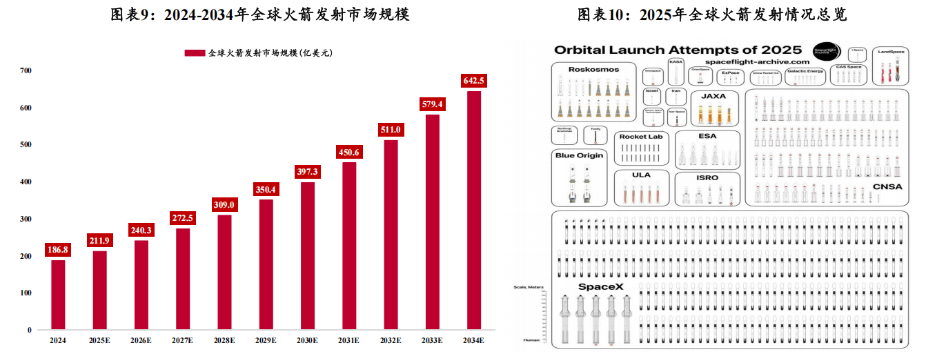 据PrecedenceResearch报告,2024年全球火箭发射服务市场收入约186.8亿美元,预计2034年将增长至642.5亿美元,年复合增长率(CAGR)约为13.15%,火箭发射市场规模有望在未来持续增长。当前,全球航天发射任务需求加速释放,发射次数、发射质量、航天器数量多项指标刷新历史纪录,带动火箭发射需求快速增长。