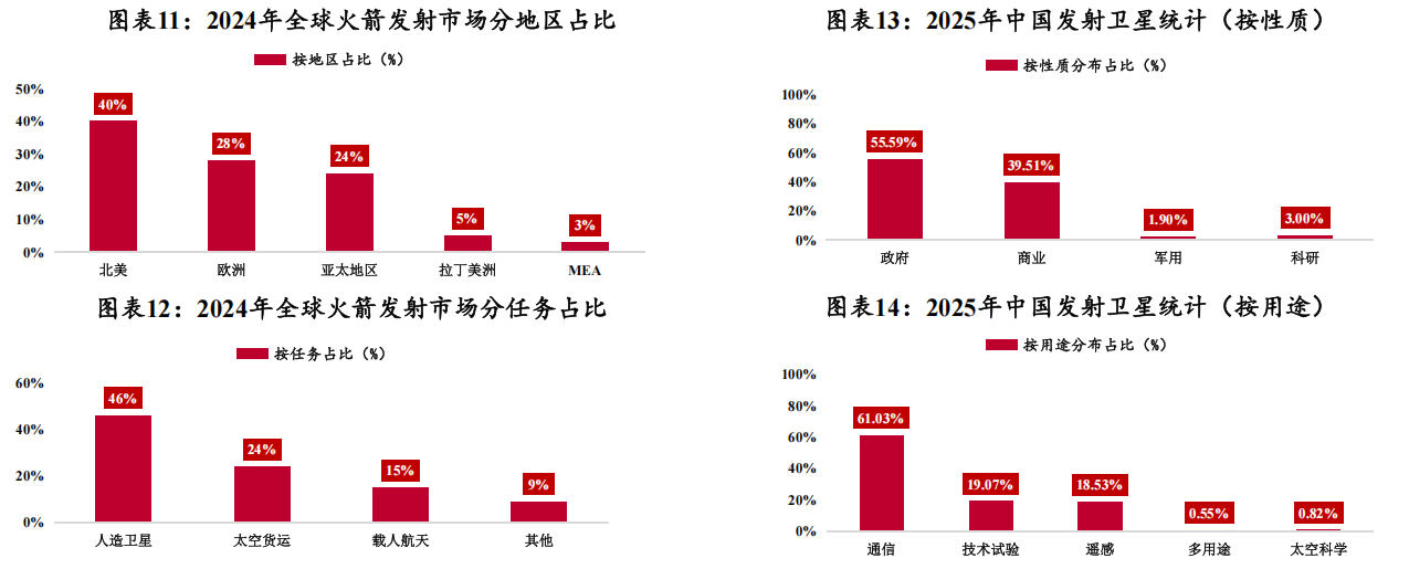 从需求端看,运载火箭任务种类多元,大致可分为政府用途(载人航天、深空探测、国防军事、科学研究)和商业用途(通信卫星、遥感卫星、导航卫星)等。预计“十五五”期间,大规模星座组网、深空探测等航天任务的加速推进,将带动运载火箭发射需求高速增长。