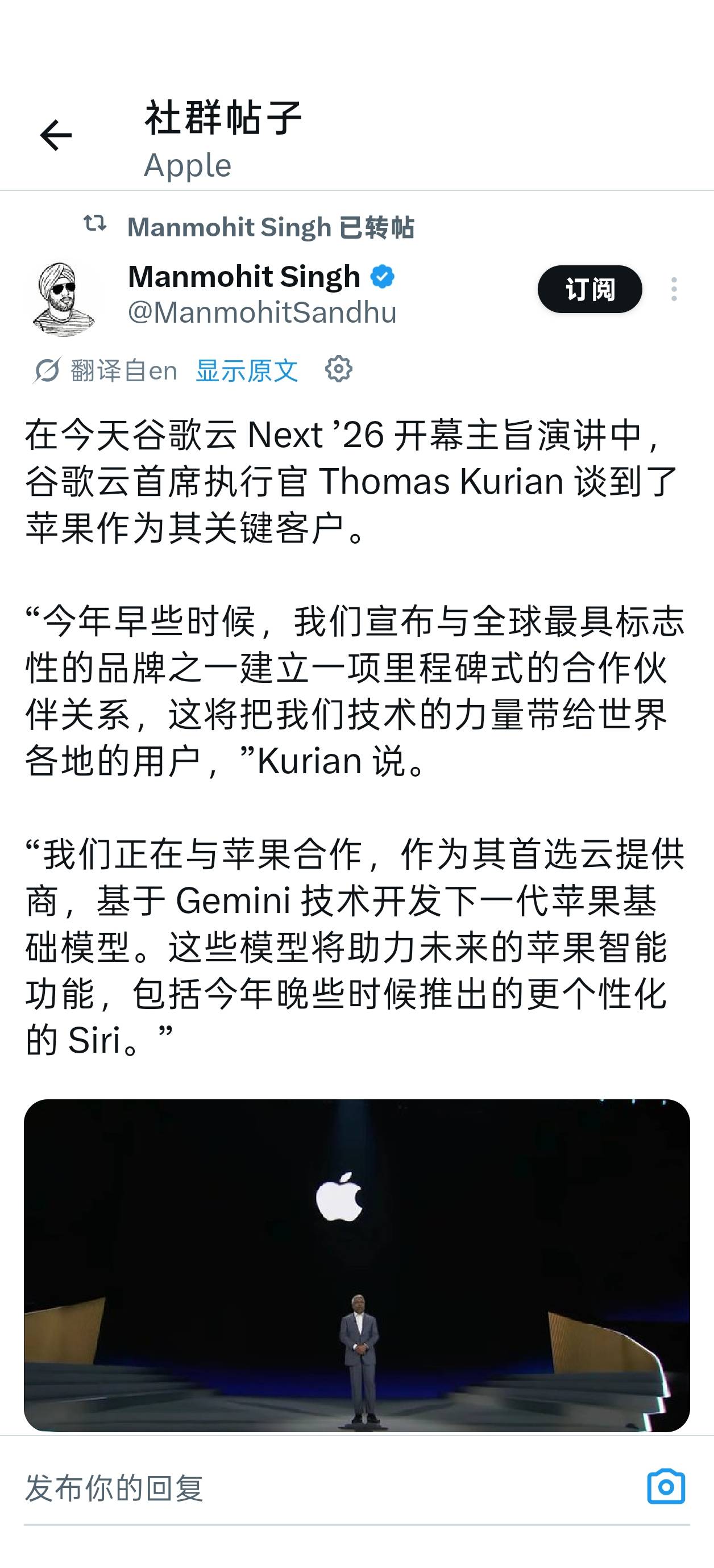 活久见!谷歌云CEO在Cloud Next 26大会上直接摊牌了:苹果新一代Siri确定今年上,底层用的就是谷歌Gemini技术。这波操作像不像苹果承认“自家AI不行”,直接找老对手谷歌借脑子?