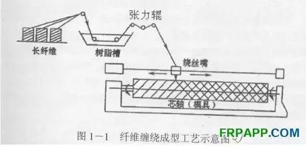 维缠绕工艺是树脂基复合材料的主要制造工艺之一。是一种在控制张力和预定线型的条件下,应用专门的缠绕设备将连续纤维或布带浸渍树脂胶液后连续、均匀且有规律地缠绕在芯模或内衬上,然后在一定温度环境下使之固化,成为一定形状制品的复合材料成型方法。纤维缠绕成型工艺示意图1-1。
