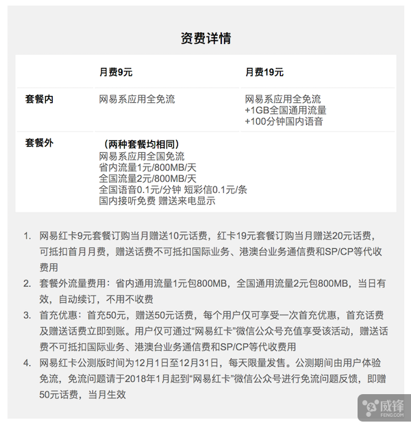 “网易红卡”分为两种套餐,一种是月费9元,另一种是月费19元。这两款套餐的用户均享有国内接听免费的服务,并且包含来电显示,超出套餐之后,每分钟语音为0.1元,彩信每条0.1元,省内流量1元/800M,国内流量2元/800M,当日有效,自动续订,不用不收费。