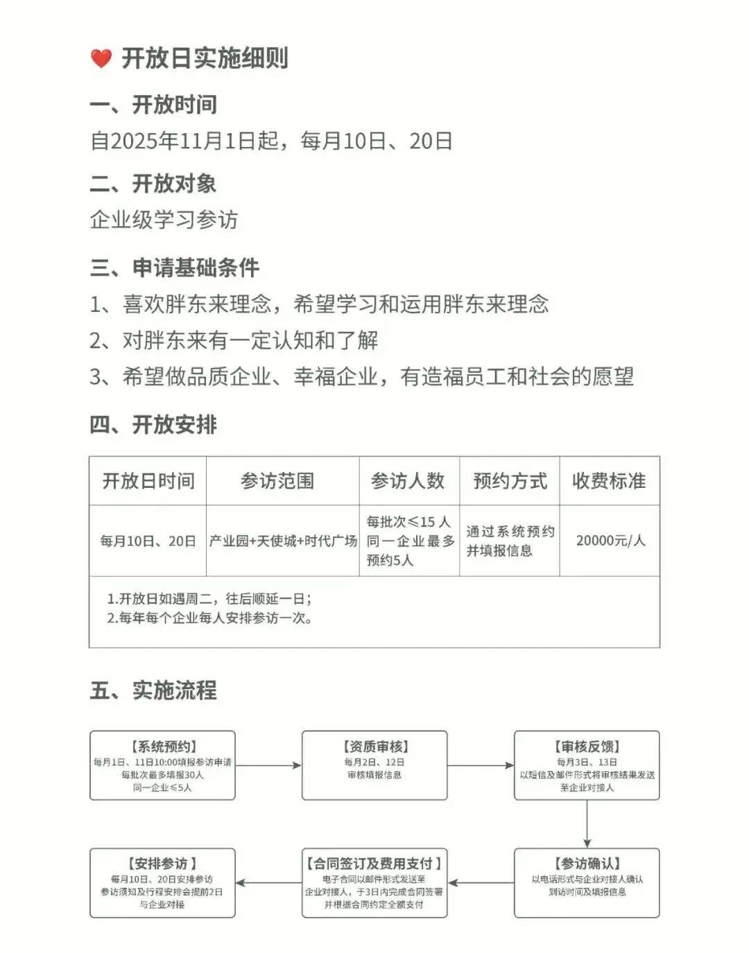 官方建议参访者提前抵达许昌,以轻松心态体验门店环境,并通过胖东来官方微信或抖音账号了解企业背景。预约流程包括系统填报、资质审核、合同签订与费用支付,最终确认参访安排。胖东来方面强调,此次开放日并非展示完美,而是希望与理念相近的企业共同进步,创造美好社会价值。所有参访信息将在活动结束后 3 个工作日内删除,以保障信息安全。