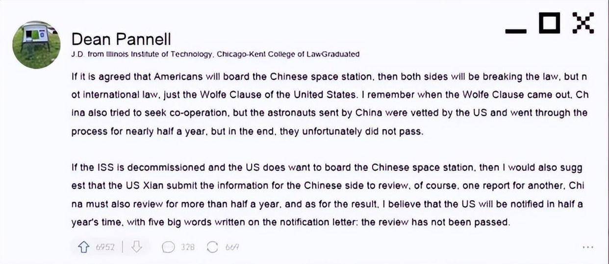 网络场域里,叙事往往更锋利。那则帖子下,有人干脆说得直白:中国空间站是完全独立建成的,没有西方国家的手把手帮忙;如果国际空间站在2030年按计划退役,那么轨道上还在运行的可能只剩天宫。还有人半调侃半认真地劝提问者“先把中文学好”,理由是站内操作手册以汉字为主;更有人回忆起曾有声音批评中文不符合“国际标准”,如今标准反倒被“现实”改写。也有人从法律切入,自称芝加哥法学院的博士生,给出冷冰冰的建议:要避免违法,最好美国人别去中国空间站,否则要撞上沃尔夫条款——这当然不约束中国人,却可能让美国机构与个人在经费与合规上吃罚。此人还提及,中方过去提出共建时曾被美方审查半年后拒绝;若未来换成美方想上门,按照对等原则,大概率要接受中方严密审核,文书一个个查,几个月后收到一纸“不合格”。也有网友直言,拒绝美国航天员并不触犯中国法律或国际条约,真正难过的是美国自家的“门槛”。甚至还有玩笑——沃尔夫条款针对“人类”,那就把美国航天员改作“非人类类别”?笑谈背后,实是规则与权力的拉扯。