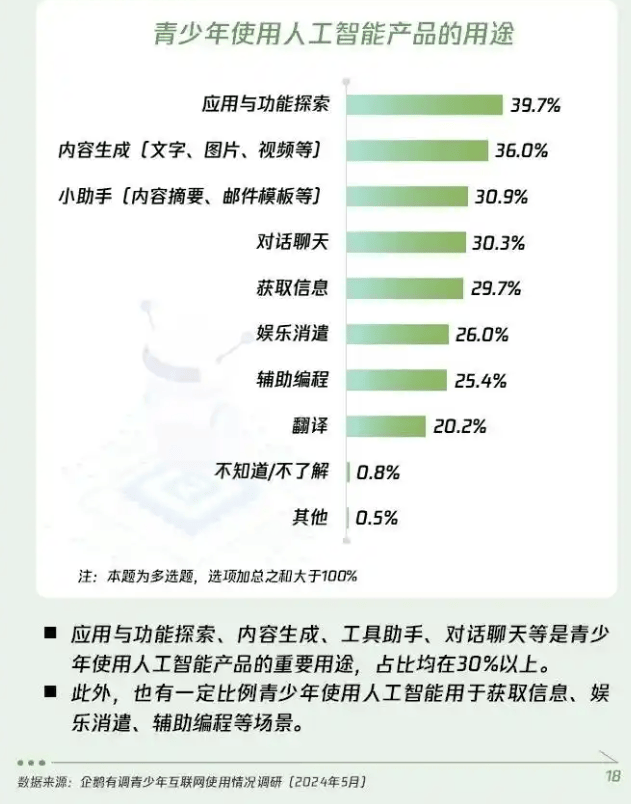 2024年,北京市委网信办、团市委指导发布的《青少年互联网使用情况调查报告(2024)》显示,受访青少年对人工智能的认知度非常高,对于人工智能的使用还处于持续探索中,尝试多种场景和用途。