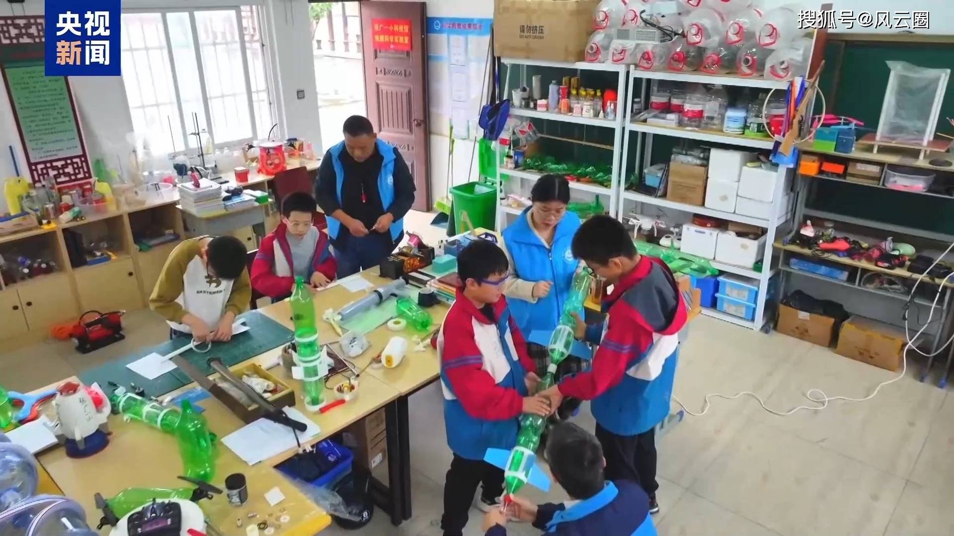“手搓”教具,是这所学校的科学课日常。科学老师张建涛带着学生,用饮料瓶和塑料袋,做出了和真实运载火箭驱动原理相似的“水火箭”。原理孩子们也明白得很,那就是利用反冲力推进。