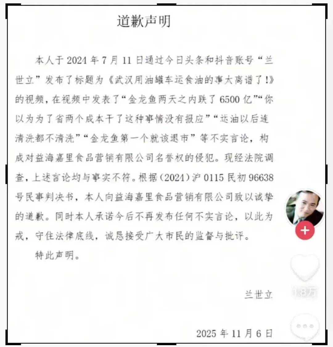 湖北前首富、民营企业家兰世立在其抖音账号中发布了一则道歉声明,因其于2024年7月11日发布的有关油罐车运食用油事件中针对著名品牌金龙鱼的不实言论,遵照相关生效民事判决向金龙鱼品牌的境内使用权人益海嘉里食品营销有限公司道歉。