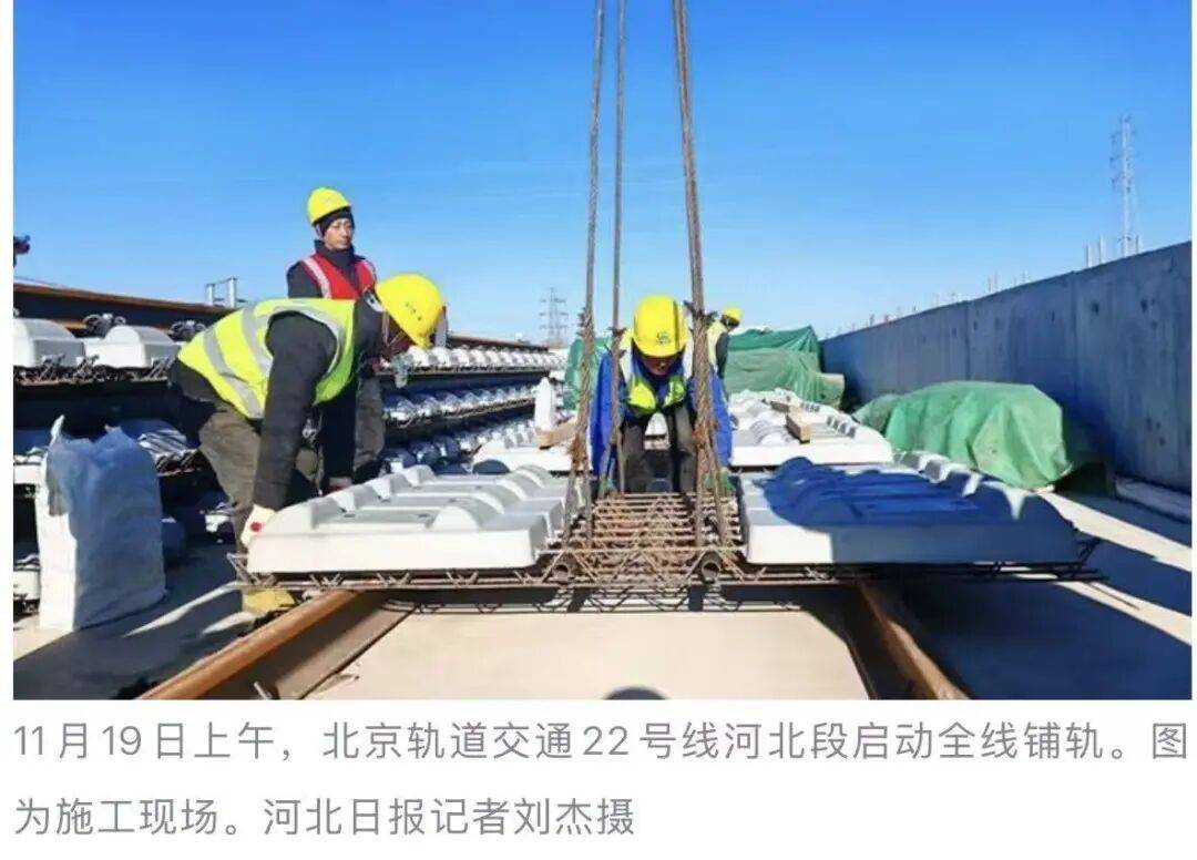 11月19日上午,在北京轨道交通22号线高楼站至齐心庄站区间施工现场,随着施工人员将首节25米标准轨排平稳铺设在U型槽道床上,这条跨越京冀的轨道交通大动脉河北段正式进入轨道铺设阶段。