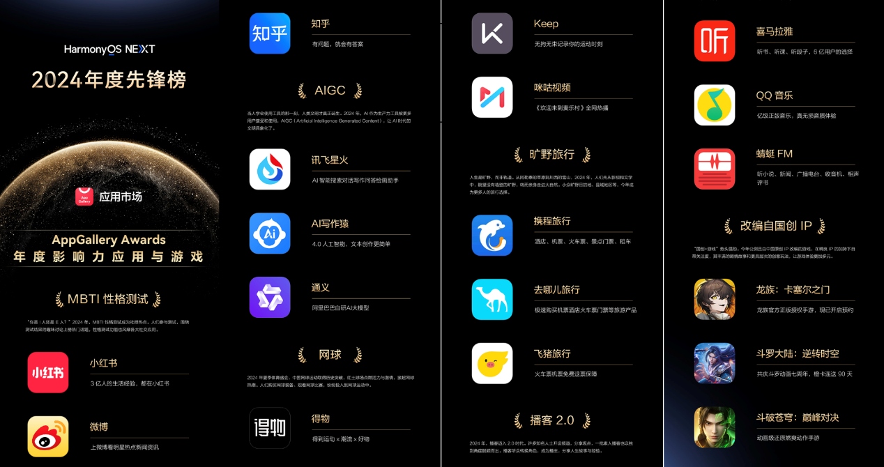 数字生活,手机里各式各样的应用也充斥着我们的日常。华为应用市场年度先锋榜,总结了在“MBTI性格测试、AIGC、网球、旷野旅行、播客2.0、改编自国创IP”6大趋势下,2024年大家最爱用的应用,比如MBTI性格测试在小红书、微博、知乎等平台风靡;讯飞星火、AI写作猿、通义等作为AIGC实用工具已经成为打工者的必备;携程旅行、去哪儿旅行、飞猪旅行为用户提供了更多元的旅行方案……这些用户使用频率高的应用与流行趋势相呼应,能够反映出时下最in的用户数字需求。
