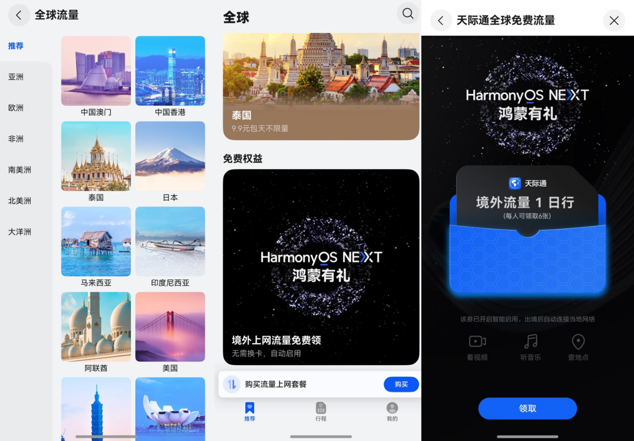 天际通可以让出境游的用户省去申请开通漫游、购买当地SIM卡等环节,简单设置,一键开启,无缝切换网络,覆盖全球100+国家和地区,还能在境外随心访问海内外APP,随时监测流量使用情况,享受轻松畅快的上网体验。升级了HarmonyOS NEXT的用户,还可在华为天际通推荐页,点击“HarmonyOS NEXT鸿蒙有礼”,领取6张境外流量1日行,年底有出境游需求的小伙伴可以赶快行动了。