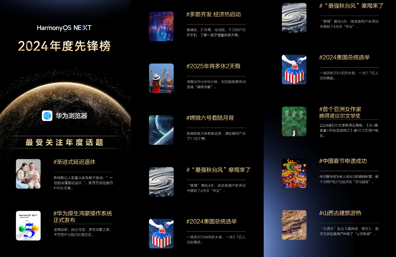 华为浏览器:嫦娥六号着陆月背、山西古建旅游热等入围最受欢迎年度线年最热点的新闻是什么吗?华为浏览器结合用户内容消费的时长、阅读量、点击率等,从国际时政、民生社会、重大政策等领域,评选出10大最受关注年度话题内容,包括:“华为原生鸿蒙操作系统正式发布”、“多箭齐发 经济热启动”、“2025年将多休2天假”、“‘最强秋台风’摩羯来了”、、“首个亚洲女作家摘得诺贝尔文学奖”、“中国春节申遗成功”、“山西古建旅游热”。其中,嫦娥六号成功实现月球背面软着陆及采样返回,载人登月进一步提上日程,受到了全国人民的持续关注;《黑神话悟空》的横空出世,进一步带火了“山西古建旅游热”,山西也成为2024年热门旅游地。通过年度专题,可以回溯过去一整年的重要新闻,反映出大家真切关心的热点内容。