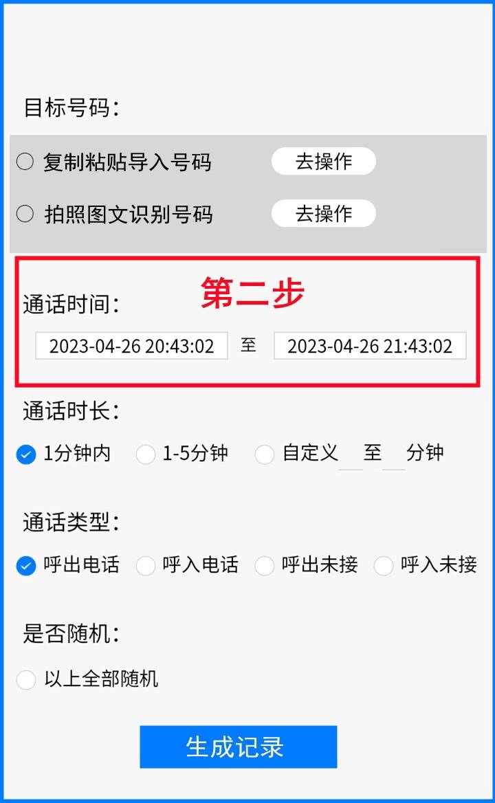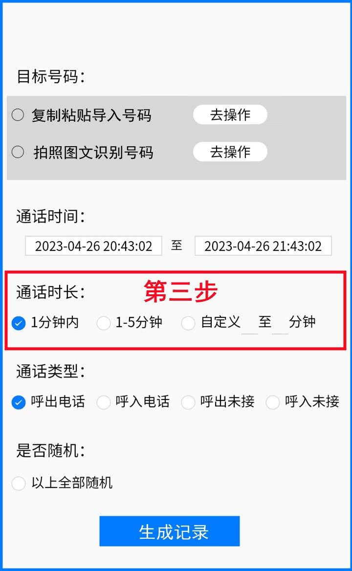 第(2)步操作:选择通话时间范围和通话时间长度。铁牛通话记录生成器上默认是过去一个小时,你也可以修改成更长的时间。通话时间范围是指你的这些所有的号码在过去一个小时或者几个小时之类发生了通话,这个动作。