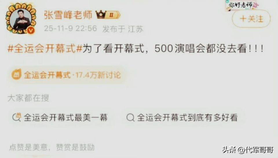 11月9日,张雪峰在微博发布了关于全运会的动态,配图为电视转播画面,表示“错过了伍佰的演唱会,下次一定补上”。然而,现场视频却显示,他正坐在演唱会的观众席上。这条微博在发布仅一小时后便被紧急删除,删除记录迅速被网友截图,质疑声随之而起。网友们纷纷表示,“撒谎避嫌”的行为令人难以理解。