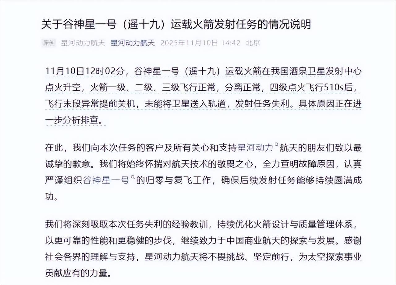 速度不够,卫星没法注入轨道。星河动力当天下午就发声明,承认失利,说原因在排查,会全力查清、归零复飞,还向客户道歉。